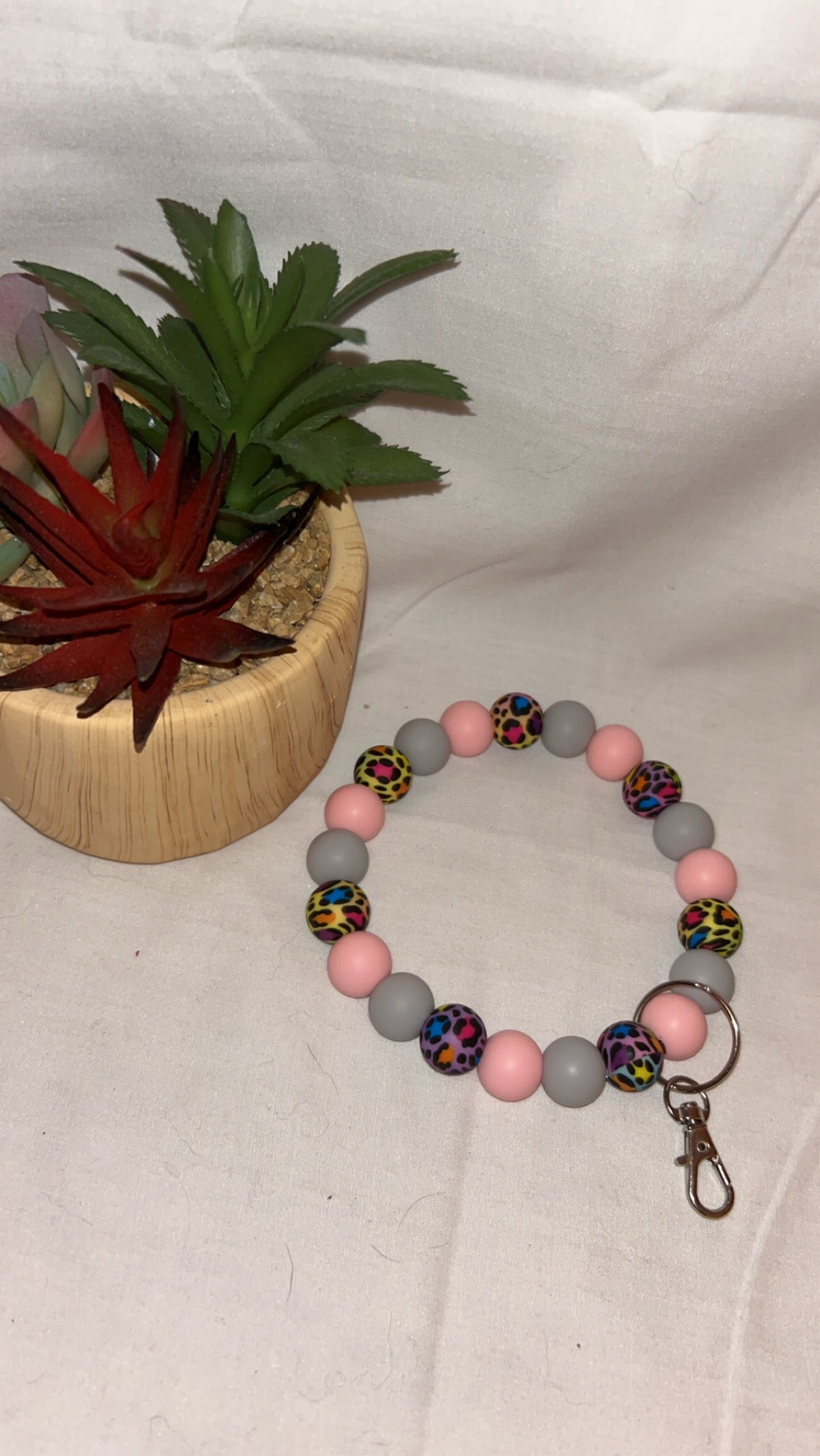 Silicone Bead wristlet with color combination of colorful cheetah, Light Grey and Soft Pink!