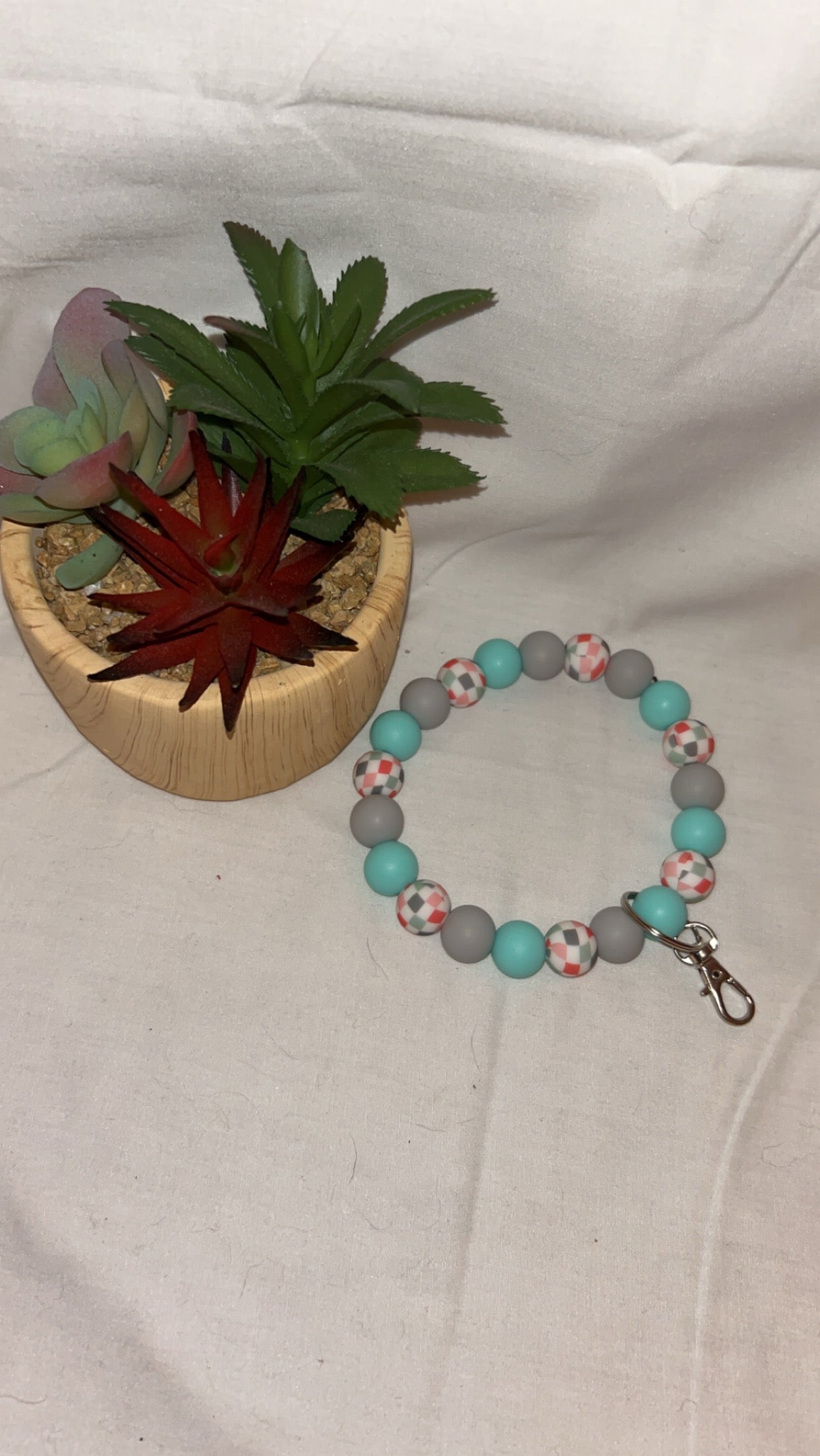 Silicone Bead wristlet with color combination of Light Turquoise , Light Grey and Colorful Checkers!