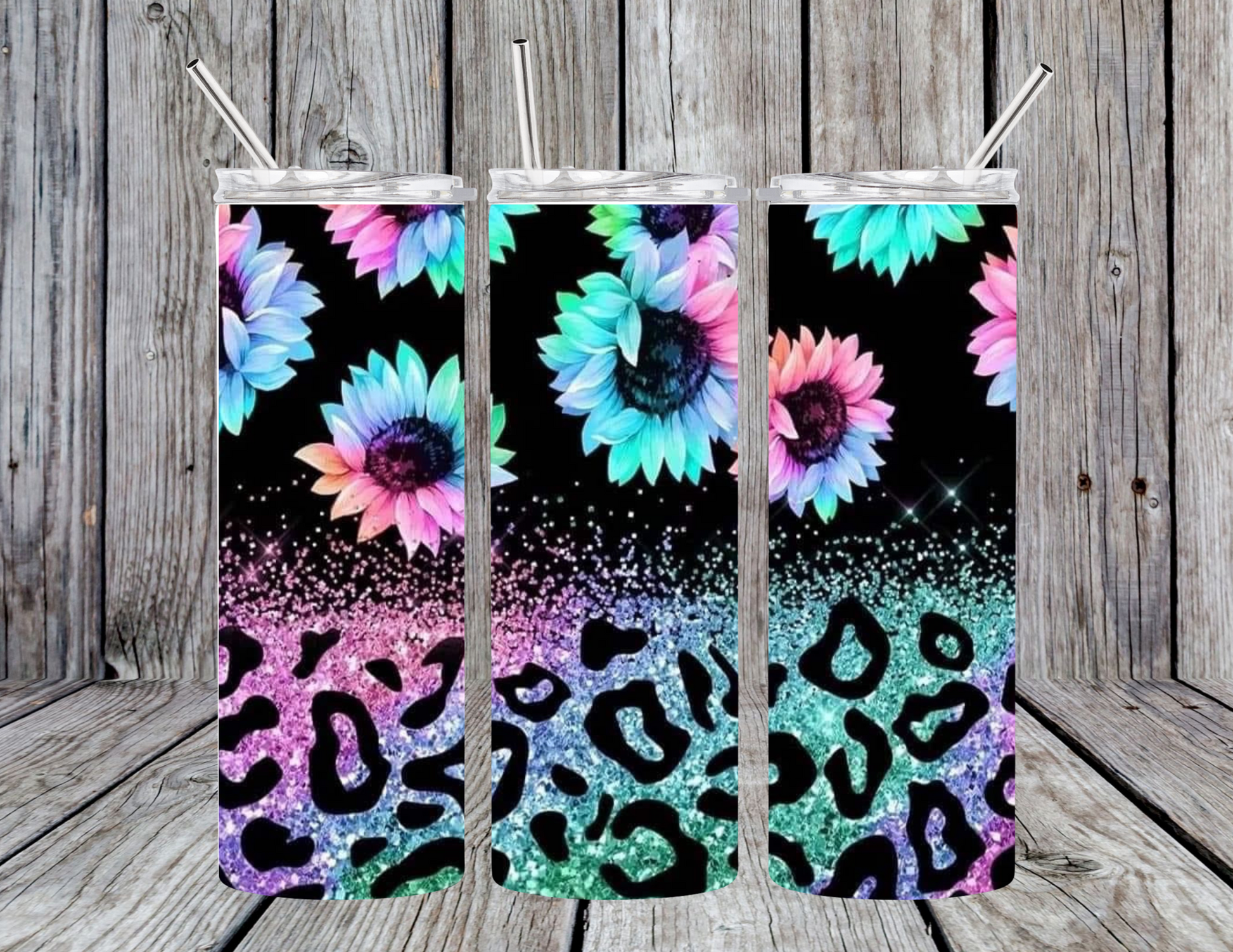 Tumbler filled with colorful sunflowers as well as cheetah print🤩