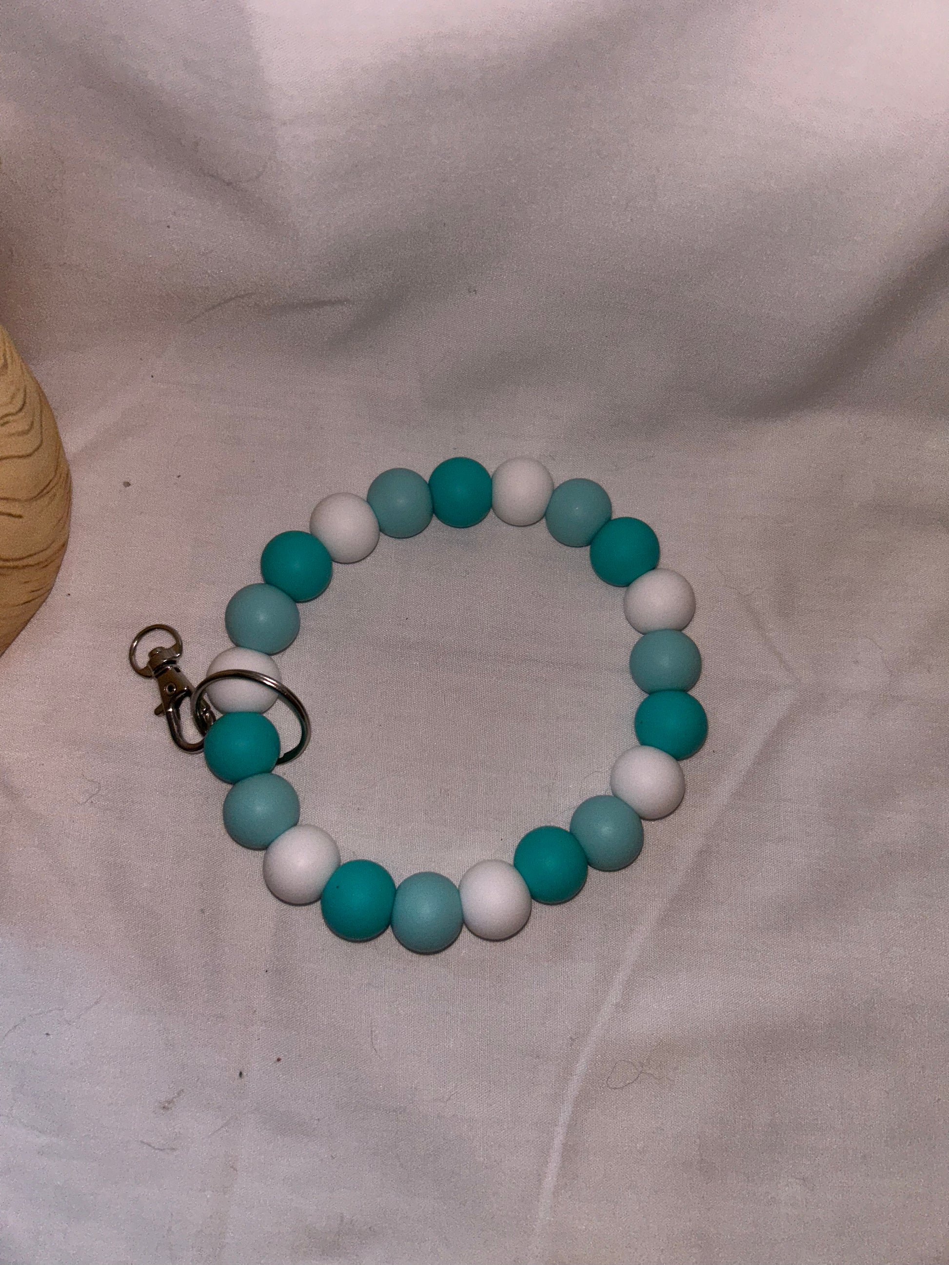 Silicone bead wristlet. Combination of Light Turquoise, Dark Turquoise and White beads.